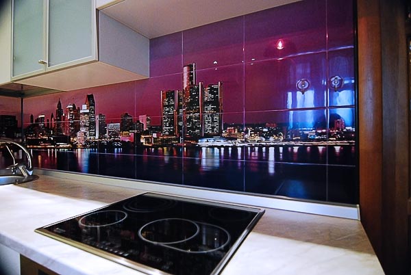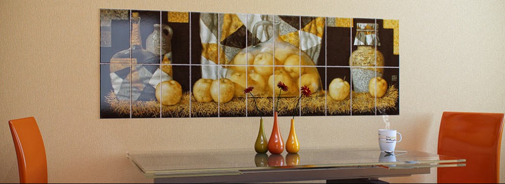 На кухне керамическая плитка обычно используется для облицовки пола и пространства между столешницей и навесными шкафами – «фартука». В отличие от известного всем скинали (фотоизображение под стеклом), в фартуке из керамической фотоплитки можно в любое время просверлить технологические отверстия для любых нужд. Для использования фотоплитки нет необходимости делать идеально ровную стену, как в случае со скинали. Также фотоплитку можно не бояться поцарапать при использовании чистящих средств